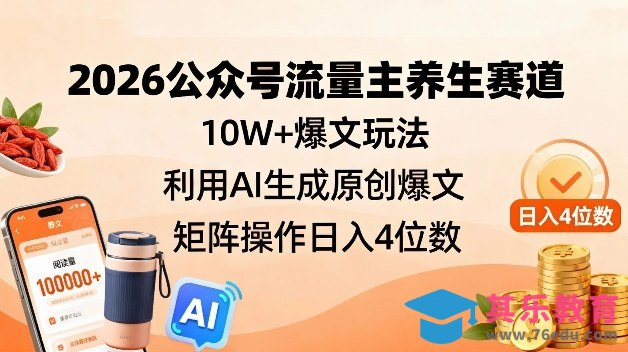 摘要: 2026公众号流量主养生赛道,10W 爆文玩法,利用AI生成原创爆文,矩阵操作日入4位数 项目介绍: 公众号流量主项目,简而言之,就是通过你的公众号吸引粉丝,然后通过广告曝光和点击来賺取收入。随着短视频的兴起,公众号的影响力逐渐下滑。微信为 2026公众号流量主养生赛道,10W 爆文玩法,利用AI生成原创爆文,矩阵操作日入4位数