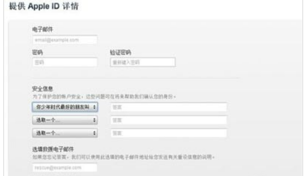 2、填写好电子邮件地址、密码、安全信息、您的出生日期等等一系列的信息,点击下面的继续按钮。流程跟上面用Apple ID官网申请是一致的,跟着系统提示走,走完流程您的Apple ID就已经创建好了。