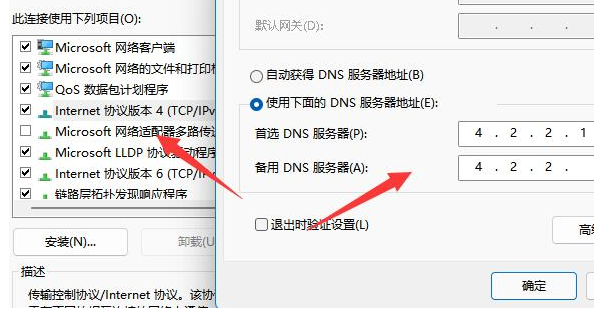 5、接着点击“internet协议版本4”,在首选DNS中输入“4.2.2.1”,备用DNS中输入“4.2.2.2”。
