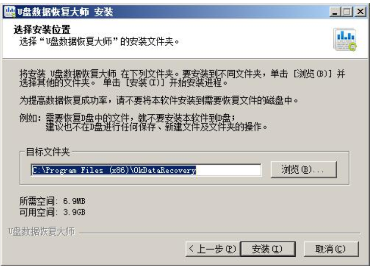 2、下一步选择软件安装目录,默认为“C:Program Files (x86)OkDataRecovery”,点击安装。